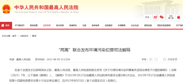 在首個全國生態日即將到來之際,最高人民法院、最高人民檢察院8月9日聯合發布關于辦理環境污染刑事案件適用法律若干問題的解釋。該司法解釋根據刑法修改情況,針對司法實踐中的新問題,從司法環節發力,依法嚴懲環境污染犯罪。