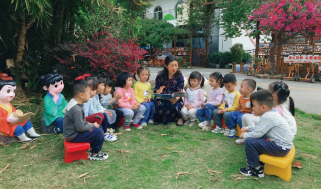 玉林市幼兒園園長蘇蔚與幼兒在戶外開展閱讀活動